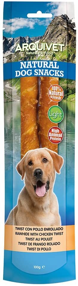 Snack sotto forma di twist di pollo. 100% naturale. Con un alto contenuto di proteine animali e pochi grassi (Prodotto Light). Alimento complementare per il tuo cane, molto ricco di nutrienti.