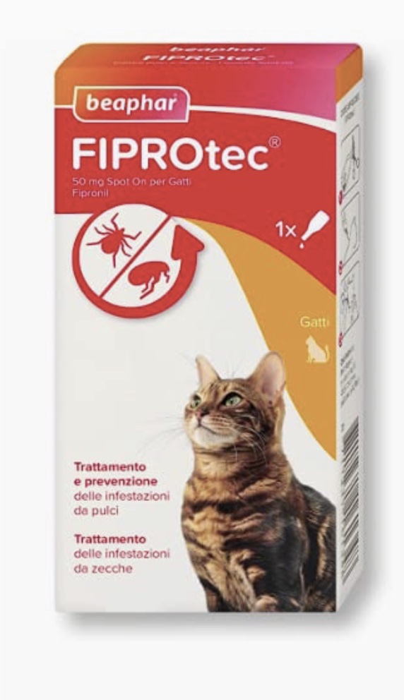 Per il trattamento e la prevenzione delle infestazioni da pulci nei gatti. Principio attivo: Fipronil 50,0 mg Soluzione limpida da incolore a leggermente gialla. Soluzione spot on 3 x 0,50 ml Fiprotec può essere usato come parte di una strategia terapeutica per il controllo della dermatite allergica da pulci, qualora sia stata precedentemente diagnosticata da un medico veterinario. Trattamento delle infestazioni da zecche. Le zecche sull’animale verranno uccise entro 48 ore.