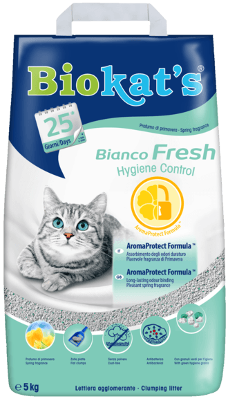 Lasciatevi incantare dalla speciale combinazione di erba fresca di taglio e gocce di rugiada mattutina. Erbe aromatiche fresche, fiori bianchi e un tocco di muschio riportano a una primavera magica. Biokat’s Bianco Fresh Hygiene Control e Biokat’s Micro Bianco Fresh con profumo di primavera si distinguono per la presenza dell’AromaProtect Formula. Questa cattura in modo affidabile gli odori sgradevoli e sprigiona la nostra piacevole fragranza primaverile. Di conseguenza Biokat’s AromaProtect Formula, creata dai nostri esperti per l’igiene del gatto, assorbe gli odori in maniera prolungata nel tempo! Le varianti profumate sono disponibili in due granulometrie. Granulometria grossa e fine.
