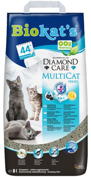 Quando in una casa vivono più gatti, è indispensabile utilizzare una lettiera particolarmente efficace, così da far sentire a proprio agio sia l’uomo che gli animali. Diamond Care MultiCat fresh di Biokat’s è un prodotto ideale e fatto su misura per le esigenze delle famiglie con più gatti. La caratteristica speciale di Diamond Care MultiCat fresh di Biokat’s è la formula 2 in 1 FreshLock Formula, che assorbe totalmente gli odori sgradevoli nelle case con più gatti e garantisce una duratura freschezza. 2 in 1 FreshLock Formula = carbone attivo + AromaProtect Formula La nostra FreshLock Formula combina carbone attivo totalmente naturale + AromaProtect Formula. Questa formula garantisce la massima neutralizzazione del cattivo odore e allo stesso tempo rende la lettiera per gatti igienica e profumata di fresco.