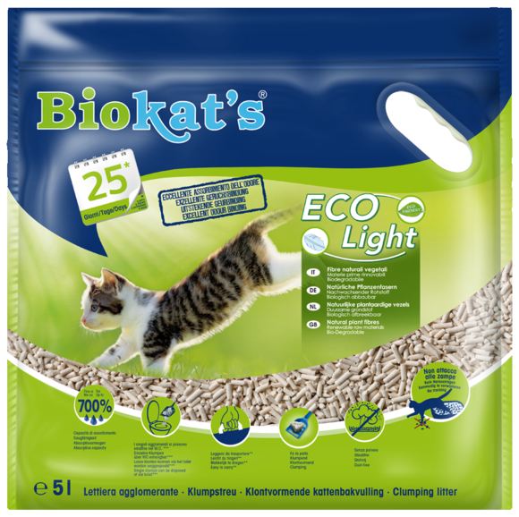 Biokat’s Eco Light è una lettiera agglomerante naturale prodotta con fibre vegetali che agiscono come una spugna. I liquidi vengono assorbiti completamente. Si formano agglomerati in cui vengono intrappolati sia i liquidi che gli odori. Biokat’s Eco Light pesa fino al 50% in meno rispetto a lettiere per gatti simili in argilla naturale. Ecco perché questo prodotto è così leggero da trasportare. Le singole zolle si smaltiscono in modo facile ed igienico!