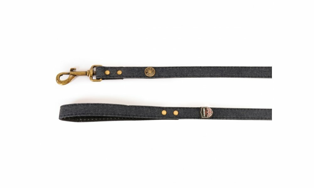 Guinzaglio in tessuto Denim con borchie in ottone coordinato con il collare della stessa linea Denim.