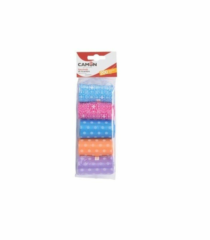 Camon Sacchetti Fantasia sono dei sacchetti di ricambio per i dispenser firmati Camon. Ideali per l’igiene e la pulizia del cane. Ogni confezione contiene 10 rotoli da 20 bustine. Fantasie assortite, non selezionabili!!