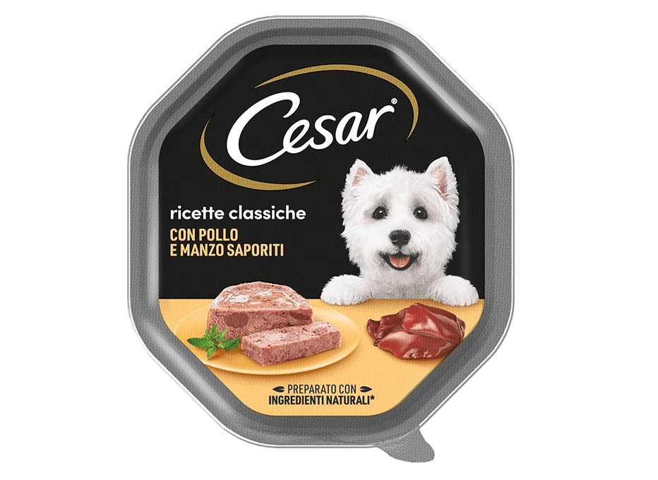 Ricette di tenero paté di carne. Sono gli intramontabili della gamma di alimenti umidi adatti all’alimentazione dei cani di piccola taglia. La cura del cane parte da una corretta alimentazione, per questo le nostre ricette rappresentano il perfetto equilibrio tra nutrimento e gusto. Tutti gli alimenti per cani di Cesar sono senza coloranti, aromi e conservanti artificiali.