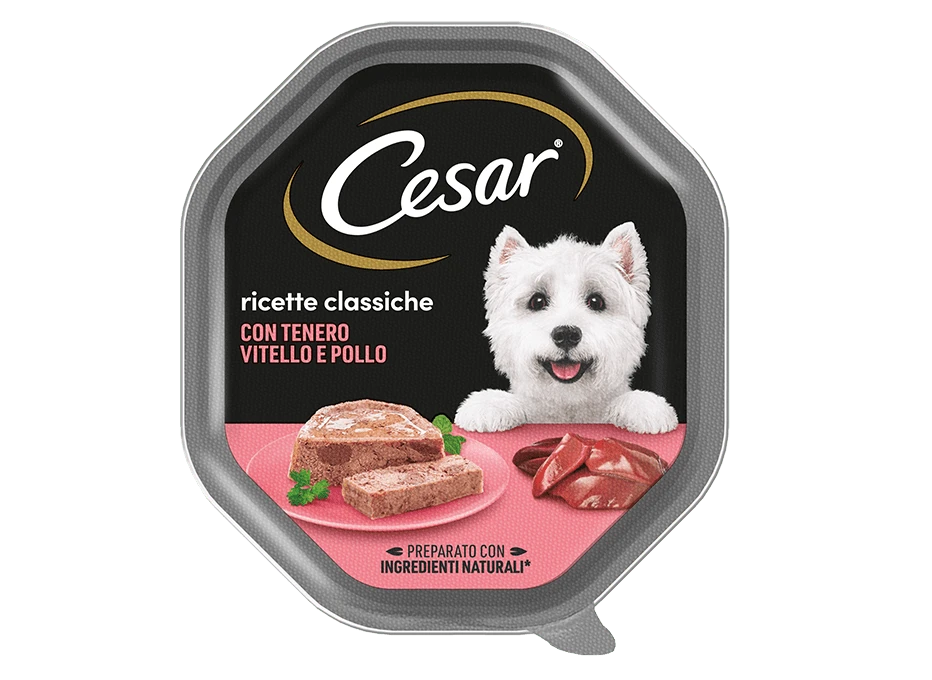 Ricette di tenero paté di carne. Sono gli intramontabili della gamma di alimenti umidi adatti all’alimentazione dei cani di piccola taglia. La cura del cane parte da una corretta alimentazione, per questo le nostre ricette rappresentano il perfetto equilibrio tra nutrimento e gusto. Tutti gli alimenti per cani di Cesar sono senza coloranti, aromi e conservanti artificiali.