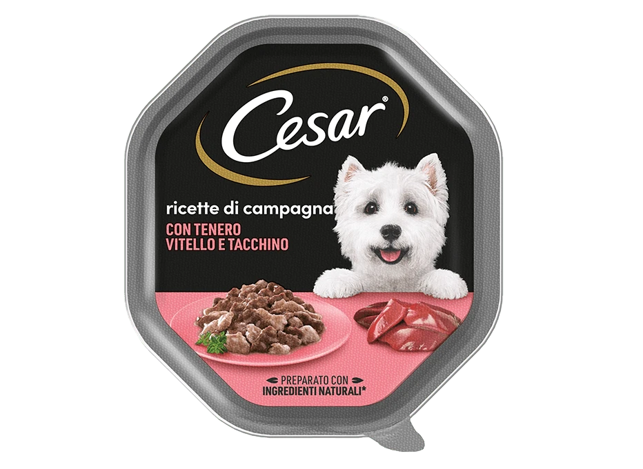 Cesar dedica un’intera gamma di alimenti umidi per cani alla tradizione culinaria italiana: le Ricette di Campagna. Prova le nostre vaschette monoporzione per assicurare al tuo cane un pasto nutriente e gustoso. Tutte le ricette Cesar non contengono aromi, coloranti e conservanti artificiali.