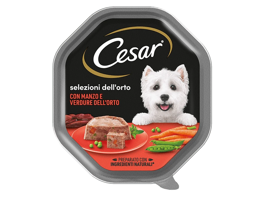 Ricette di tenero paté di carne e verdure. Un’alimentazione per cani giusta ed equilibrata prevede anche l’assunzione di verdure per un corretto apporto di vitamine e minerali. Cesar propone la linea di ricette Selezioni Dell’Orto, ispirate alla nostra tradizione di alimenti umidi che uniscono gusto al nutrimento. Tutti gli alimenti per cani di Cesar sono senza coloranti, aromi e conservanti artificiali.