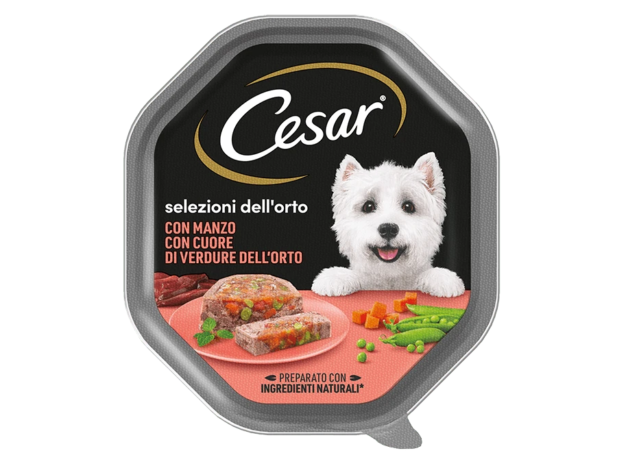 Ricette di tenero paté di carne e verdure. Un’alimentazione per cani giusta ed equilibrata prevede anche l’assunzione di verdure per un corretto apporto di vitamine e minerali. Cesar propone la linea di ricette Selezioni Dell’Orto, ispirate alla nostra tradizione di alimenti umidi che uniscono gusto al nutrimento. Tutti gli alimenti per cani di Cesar sono senza coloranti, aromi e conservanti artificiali.