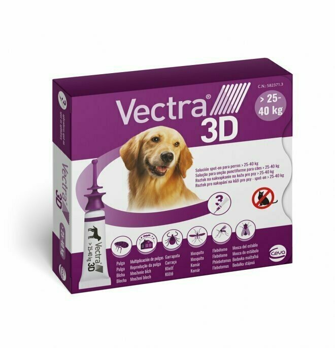 Vectra 3D è usato nei cani per il trattamento e la prevenzione di infestazioni da pulci e zecche. Inoltre, esercita un’azione repellente contro flebotomi, zanzare e mosche. ( Stomoxys calcitrans ). La sua azione dura fino a un mese e previene la moltiplicazione delle pu lci, inibendo l’ apertura delle uova e la comparsa degli adulti per due mesi. Può essere utilizzato anche nell’ambito di una strategia per il trattamento della dermatite allergica da pulci (una reazione allergica ai morsi di pulce).
