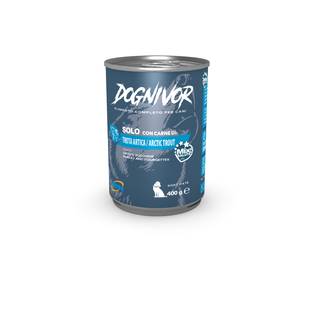 Composizione: trota artica 88%, orzo 4%, zucchine 2%