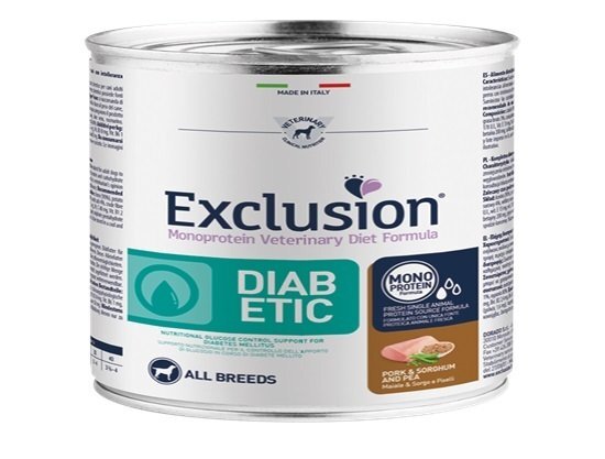 Exclusion Monoprotein Veterinary Diet Formula Diabetic è un alimento dietetico con formulazione monoproteica, realizzato con un’unica fonte alternativa di proteine animali, ingredienti innovativi e preservato con tocoferoli naturali; rappresenta la risposta nutrizionale a disposizione del Veterinario, differenziata per taglia, come supporto nutrizionale per il controllo dell’apporto di glucosio in corso di diabete mellito.
