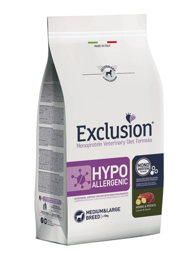Exclusion Monoprotein Veterinary Diet Formula Hypoallergenic è un alimento dietetico con formulazione monoproteica, realizzato con un’unica fonte alternativa di proteine animali, ingredienti innovativi e preservato con tocoferoli naturali; rappresenta la risposta nutrizionale a disposizione del Veterinario, differenziata per taglia, come supporto nutrizionale per cani con intolleranze alimentari.