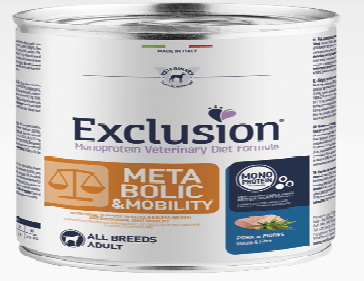 Exclusion Monoprotein Veterinary Diet Formula Metabolic & Mobility un alimento dietetico con formulazione monoproteica, realizzato con un’unica fonte alternativa di proteine animali, ingredienti innovativi e preservato con tocoferoli naturali; rappresenta la risposta nutrizionale a disposizione del Veterinario, differenziata per taglia, come supporto nutrizionale per ridurre l’eccesso di peso e favorire la mobilità articolare.