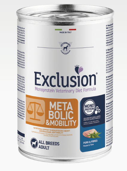Exclusion Monoprotein Veterinary Diet Formula Metabolic & Mobility un alimento dietetico con formulazione monoproteica, realizzato con un’unica fonte alternativa di proteine animali, ingredienti innovativi e preservato con tocoferoli naturali; rappresenta la risposta nutrizionale a disposizione del Veterinario, differenziata per taglia, come supporto nutrizionale per ridurre l’eccesso di peso e favorire la mobilità articolare.