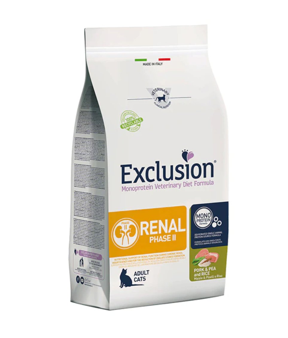 Caratteristiche: Exclusion Monoprotein Veterinary Diet Formula Renal Phase II è un alimento dietetico completo per gatti adulti formulato per il supporto della funzione renale in caso di insufficienza renale cronica. Questo alimento dietetico contiene un ridotto tenore di proteine di elevata qualità e una bassa concentrazione di fosforo. E’ indicato anche per la riduzione della formazione di calcoli a base di ossalati grazie alla bassa concentrazione di calcio, vitamina D e alle proprietà alcalinizzanti dell’urina.