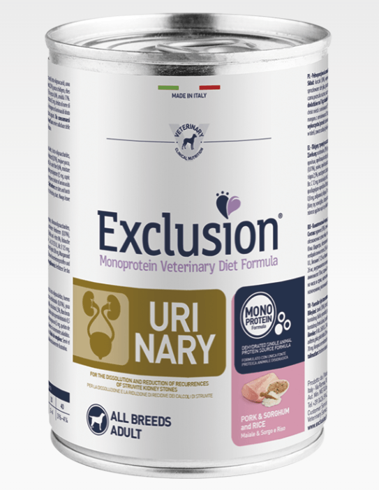 Exclusion Monoprotein Veterinary Diet Formula Urinary è un alimento dietetico con formulazione monoproteica, realizzato con un’unica fonte alternativa di proteine animali, ingredienti innovativi e preservato con tocoferoli naturali; rappresenta la risposta nutrizionale a disposizione del Veterinario, differenziata per taglia, come supporto nutrizionale per la dissoluzione e la riduzione di recidive dei calcoli di struvite.