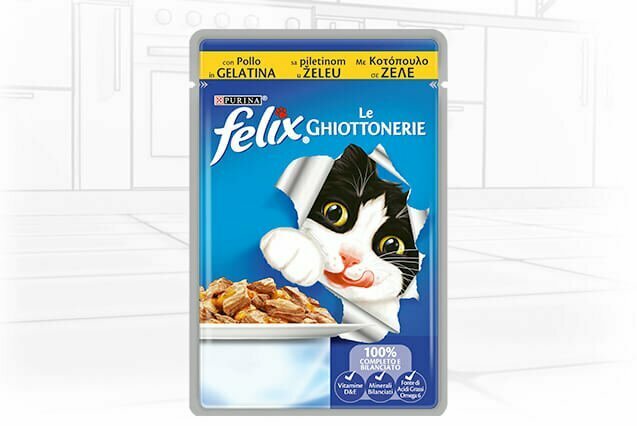 Felix Le Ghiottonerie è una gamma di deliziose ricette così gustose ed invitanti che ti sembrerà di averle cucinate con le tue mani. Sono state appositamente preparate con teneri pezzettini di carni avvolti in una golosa gelatina per offrire ogni giorno al tuo gatto un piatto assolutamente irresistibile! Inoltre con FELIX Le Ghiottonerie puoi scegliere tra una vasta gamma di ricette con carni o pesci per sorprenderlo ogni giorno con un gusto sempre diverso! Queste deliziose ricette sono una fonte di acidi grassi essenziali Omega 6, e hanno la giusta combinazione di vitamine e minerali bilanciati, che sono una fonte di benessere che soddisfa al 100% il fabbisogno giornaliero del tuo gatto se somministrate seguendo le modalità d’uso e la razione giornaliera riportate sulla confezione.