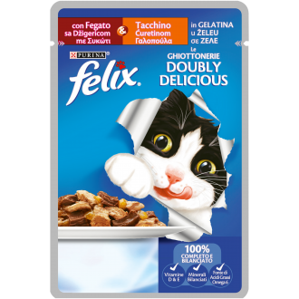 FELIX Le GHIOTTONERIE Doubly Delicious è una gamma di saporite ricette per gatti preparate con due differenti gusti in una deliziosa gelatina.