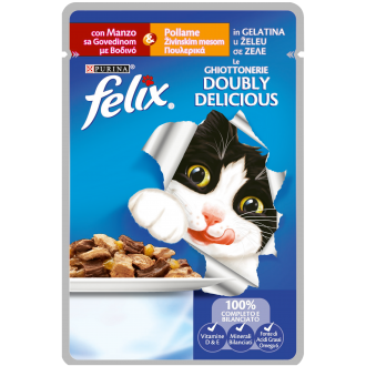 FELIX Le GHIOTTONERIE Doubly Delicious è una gamma di saporite ricette per gatti preparate con due differenti gusti in una deliziosa gelatina.