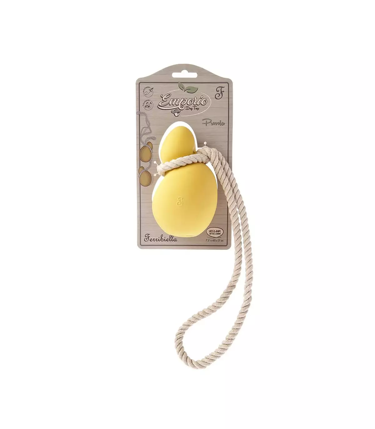 Simpaticissimo giochino per cane Ferribiella Emporio provola, realizzato in lattice+corda.
