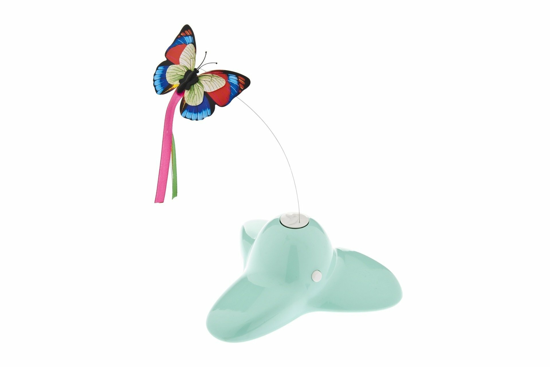 Farfalla dispettosa in plastica per gatti. La farfalla dispettosa è un giocattolo rotante per gatti, questo giocattolo ha tre batterie AA (non incluse) e due farfalle incluse.