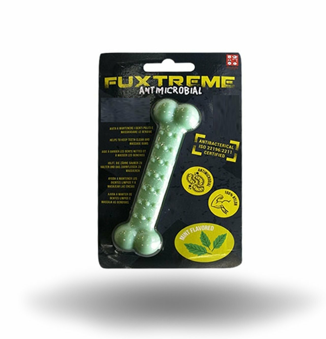 Ferribiella Fuxtreme Osso Antimicrobico menta è un gioco per cani a forma di osso della Ferribiella. Antimicrobico, si prende cura di denti e gengive, super resistente, 100% Nylon.