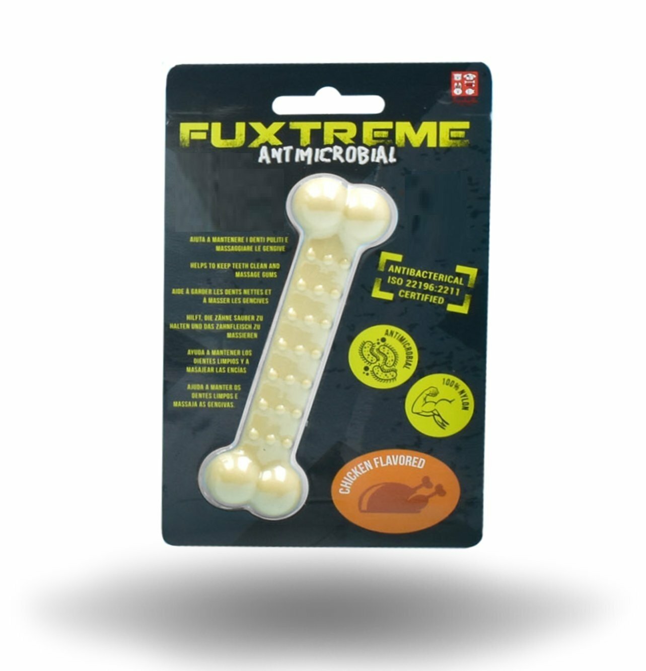 Ferribiella Fuxtreme Osso Antimicrobico pollo è un gioco per cani a forma di osso della Ferribiella. Antimicrobico, si prende cura di denti e gengive, super resistente, 100% Nylon.