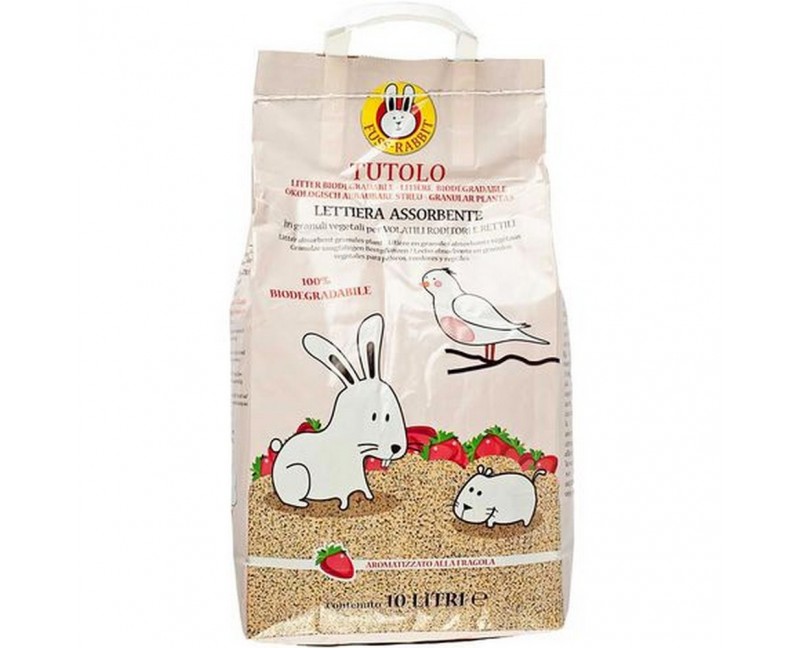 Lettiera igienica assorbente in granuli vegetali per volatili, roditori e rettili al profumo di fragola.