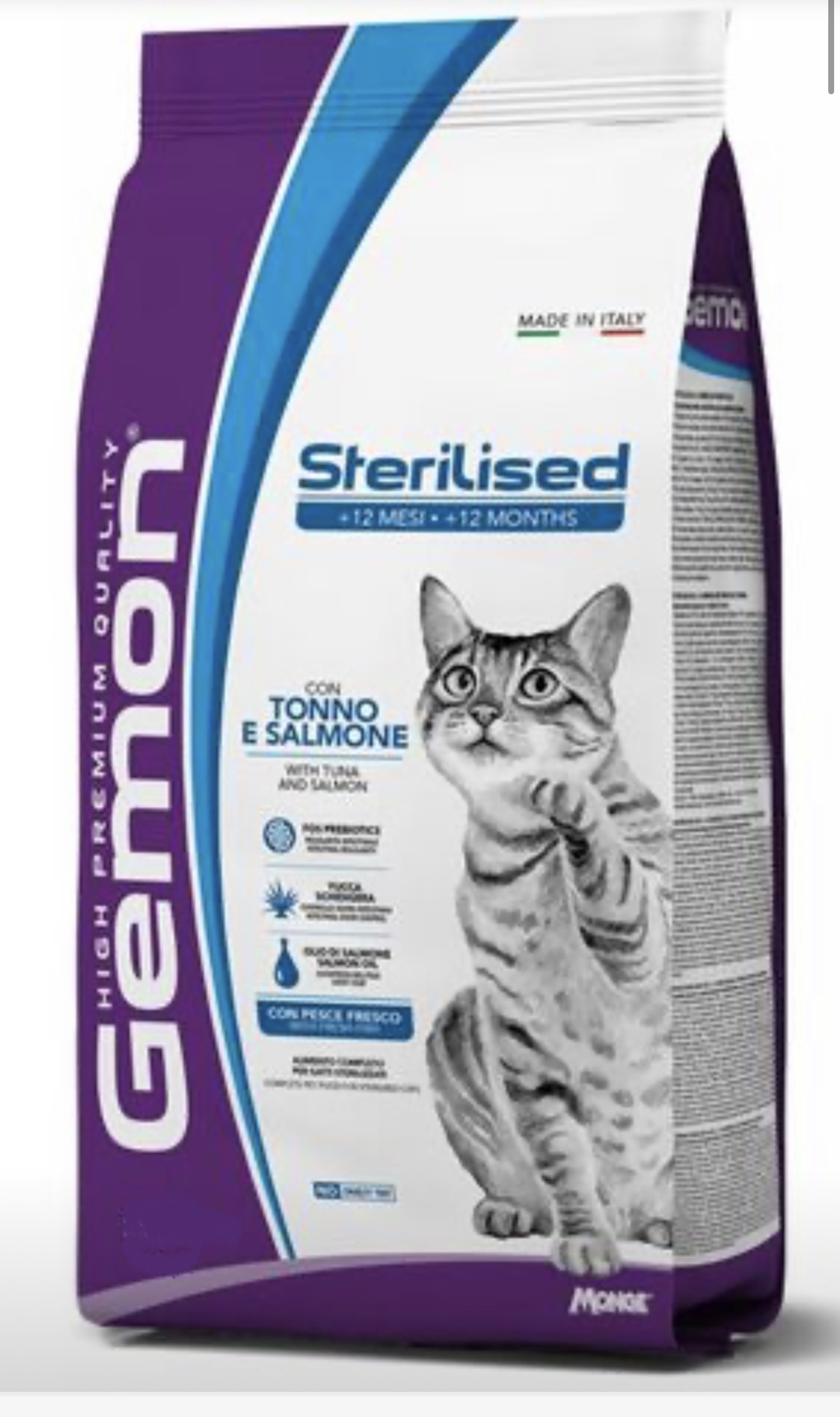 GEMON STERILISED CAT CON TONNO E SALMONE è un alimento completo per gatti adulti sterilizzati.