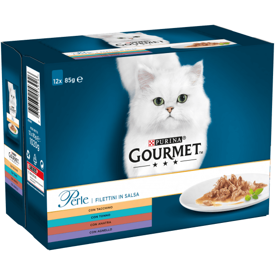Gourmet Perle Filettini in Salsa con Tacchino, Tonno, Anatra, Agnello – 12 x 85 gr