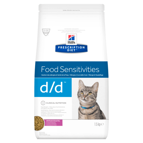 Prescription Diet d/d alimento per gatti è un alimento dietetico completo per la riduzione delle intolleranze ai materiali e nutrienti alimentari e per supportare la funzionalità cutanea in caso di dermatosi ed eccessiva perdita di pelo nei gatti. Questo alimento dietetico contiene fonti di proteine e di carboidrati selezionate ed elevati livelli di acidi grassi essenziali.
