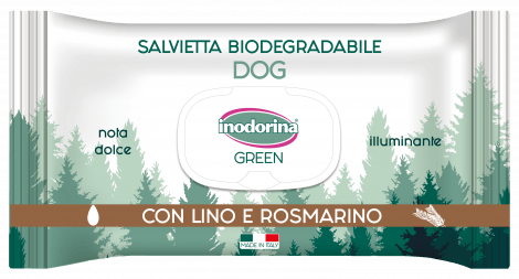 Inodorina green è la nuova salvietta compostabile utile per la pulizia degli animali, realizzata in morbida fibra tessile biodegradabile, umidificata con una dolce nota di Lino e rosmarino per un pelo illuminante.