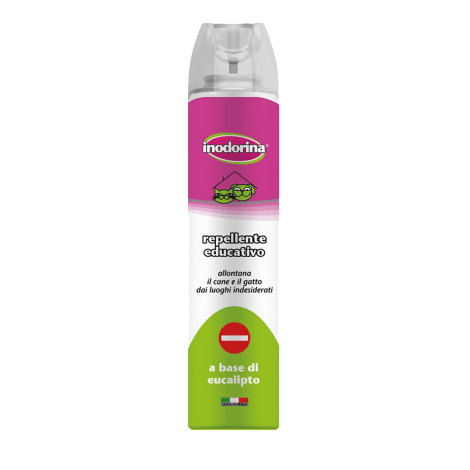 Lo spray repellente Inodorina è ideale per correggere le cattive abitudini del cane e del gatto, allontanandoli dal punto trattato senza nuocere alla loro salute. A base di eucaliptolo ha un profumo naturale, fresco e gradevole ed è innocuo per l’uomo. Può essere erogato su superfici sia interne che esterne.