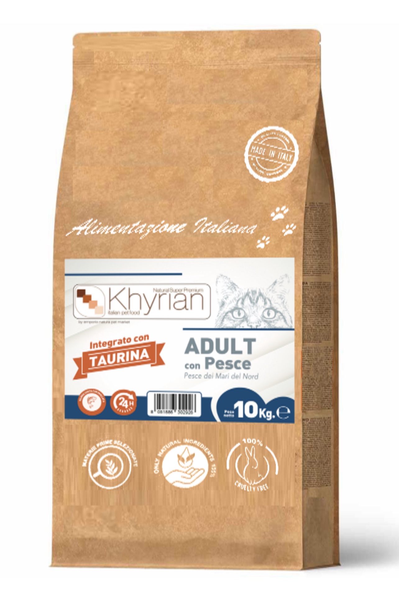 Khyrian gatto è un alimento superpremium integrato con taurina per le sue proprietà antiossidanti, digestive e per i benefici generali legati al fabbisogno del gatto di questo importante aminoacido. Questo alimento è caratterizzato da una cottura a basse temperature che permette di salvaguardare le proprietà organolettiche del prodotto, utilizziamo solo materie prime controllate per lo più da filiera corta 100% italiana che ci garantisce genuinità ed appetibilità impareggiabili. Le crocchette per gatti Khyrian sono caratterizzate inoltre da un peso specifico molto leggero che le rende estremamente digeribili.