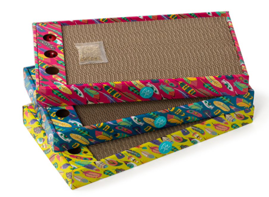 TIRAGRAFFI IN CARTONE CON BANDE COLORATE ED ERBA GATTA E PALLINE INTERNE.