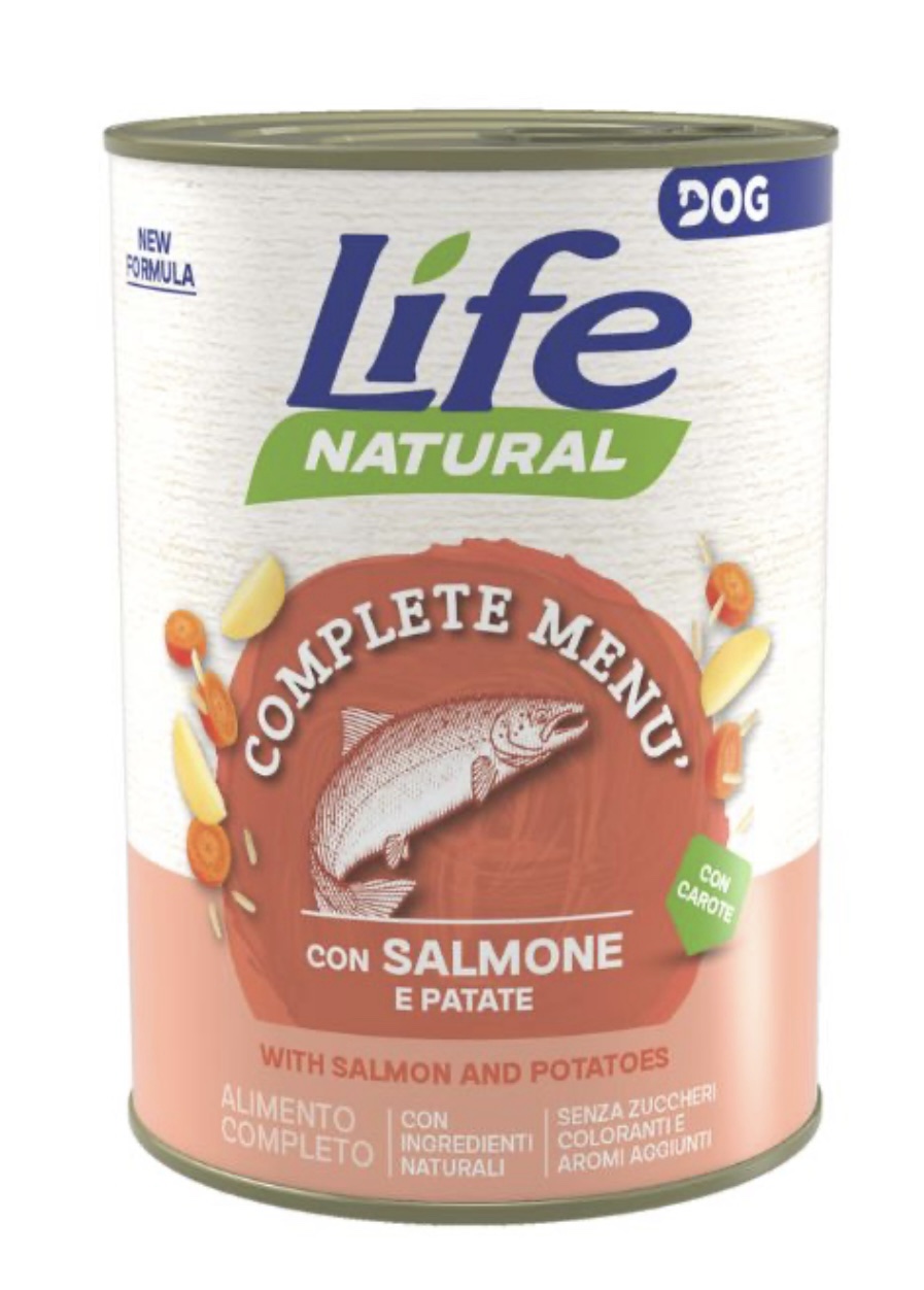 Life Dog Natural – Complete Menu’ – Salmone e Patate 400 Gr. è un alimento con carne di prima scelta, tagliata a pezzettoni o macinata, si apportano proteine di elevata qualità biologica, in equilibrio con grassi e carboidrati.