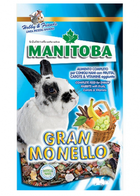 Gran Monello mix Coniglietto della Manitoba è un mangime completo e specifico per coniglietti, particolarmente indicato per le cavie, poichè è realizzato senza cereali estrusi ed è ricco di ortaggi e frutta come ad esempio il faggiolino, pisello e fave, carruta, banana, uva e albicocca ed integrato con vitamine e sali minerali.