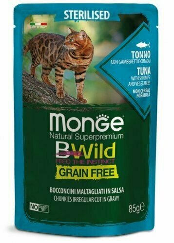 Monge Natural Super Premium Bwild Grain Free Formula Gatto Sterilizzato Tonno con gamberetti e ortaggi (fagiolini e carote) è un alimento completo e bilanciato per gatti adulti sterilizzati.