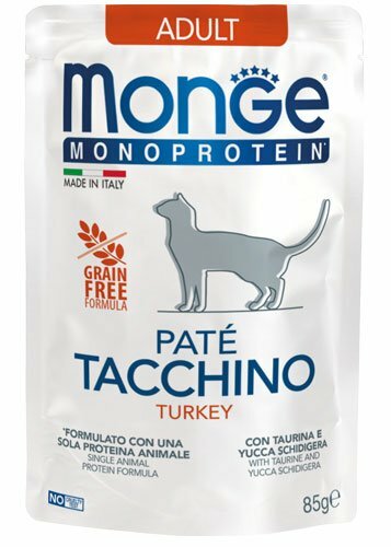 Monge Natural Superpremium Monoprotein* Gatto adulto Tacchino è un alimento completo e bilanciato per i gatti adulti. Formulato con una singola fonte proteica animale, il tacchino, e una singola fonte di carboidrati, le patate.