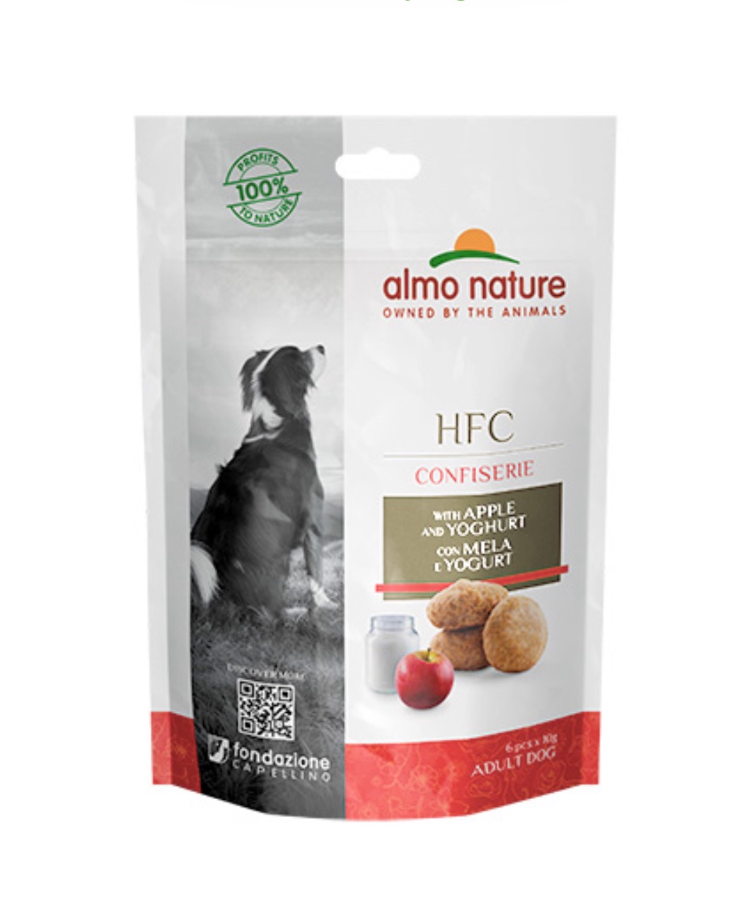 HFC Almo Nature Cane Snack Confiserie Mela e yogurt 60 Gr. è uno snack per cani di Almo Nature preparato con ingredienti puri, cioè in origine idonei al consumo umano.