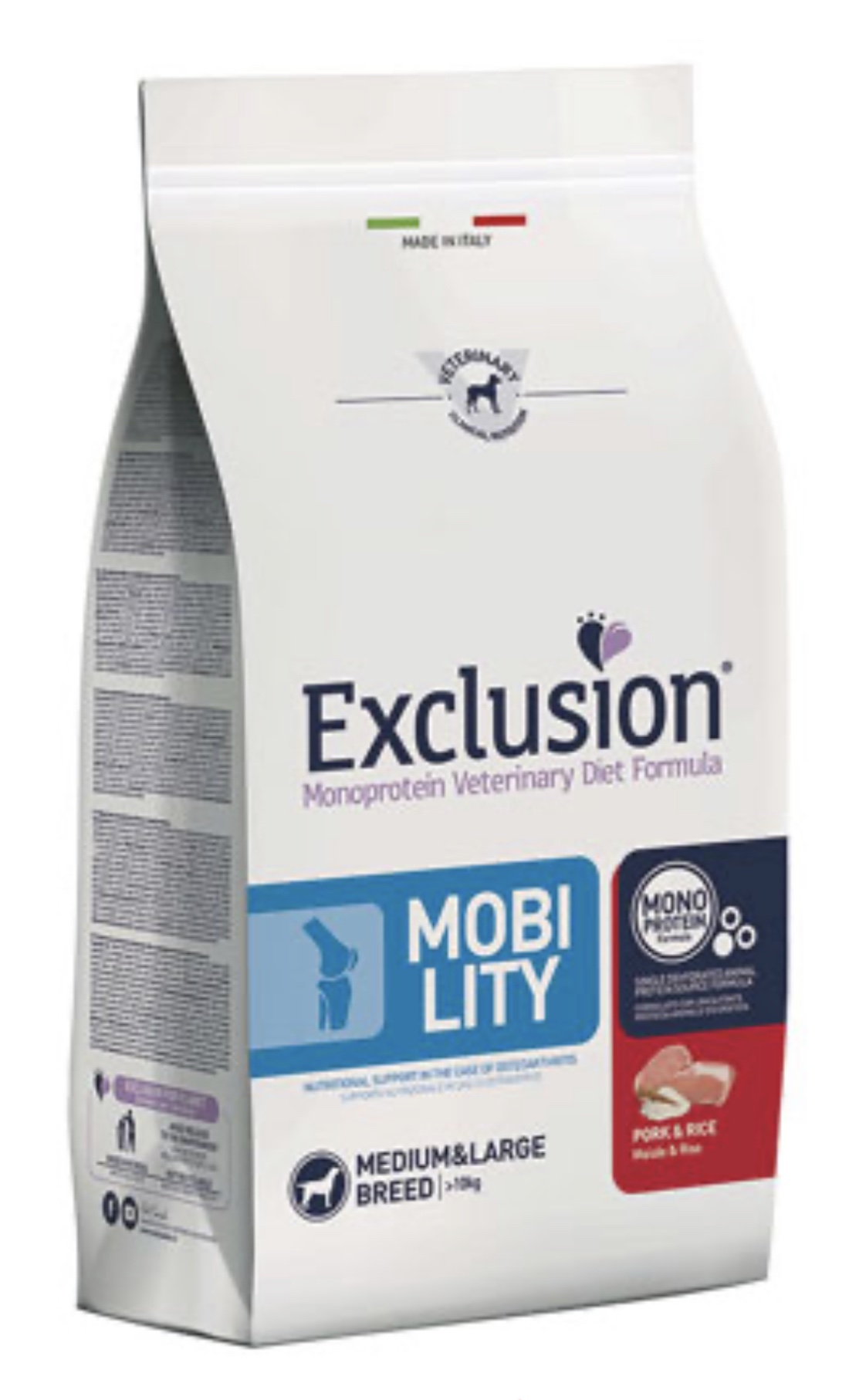 Exclusion Monoprotein Veterinary Diet Formula Mobility è un alimento dietetico con formulazione monoproteica, realizzato con un’unica fonte alternativa di proteine animali, ingredienti innovativi e preservato con tocoferoli naturali; rappresenta la risposta nutrizionale a disposizione del Veterinario, differenziata per taglia, come supporto nutrizionale per favorire la mobilità articolare.