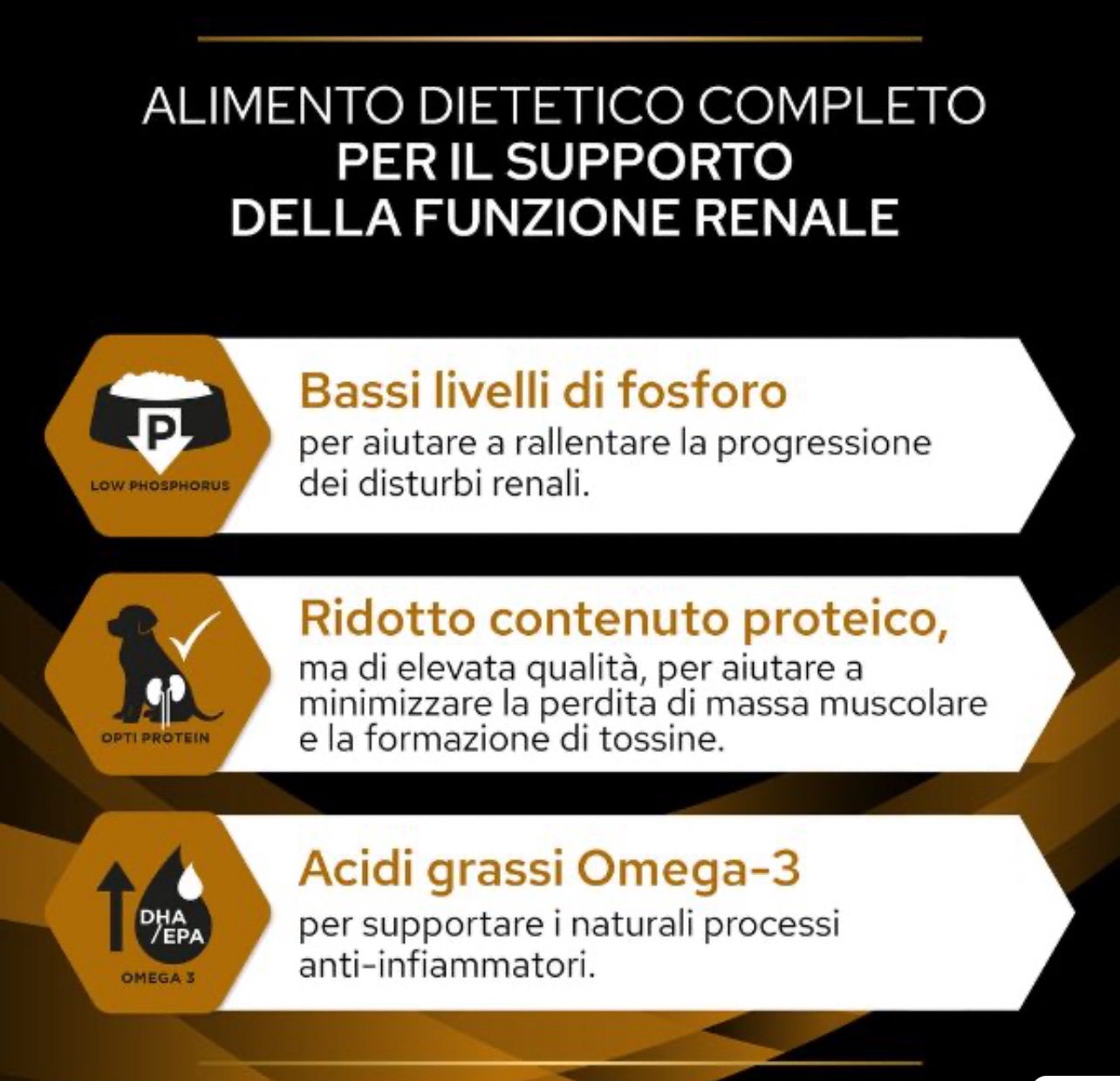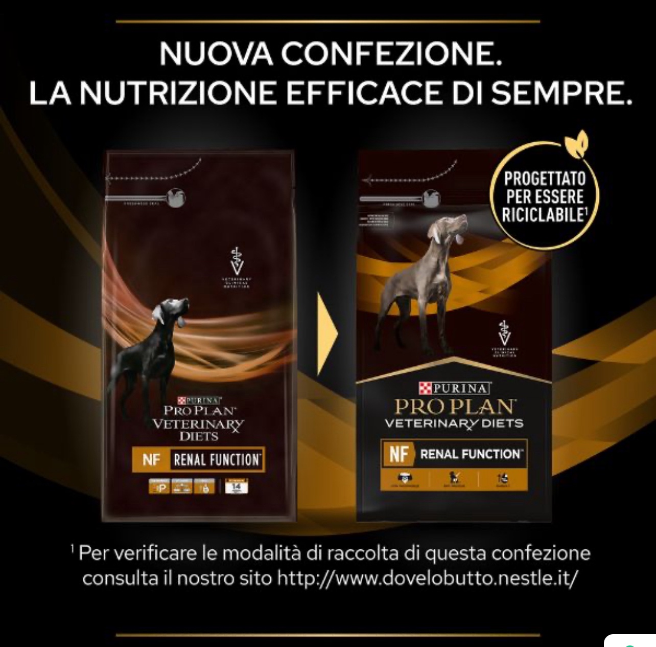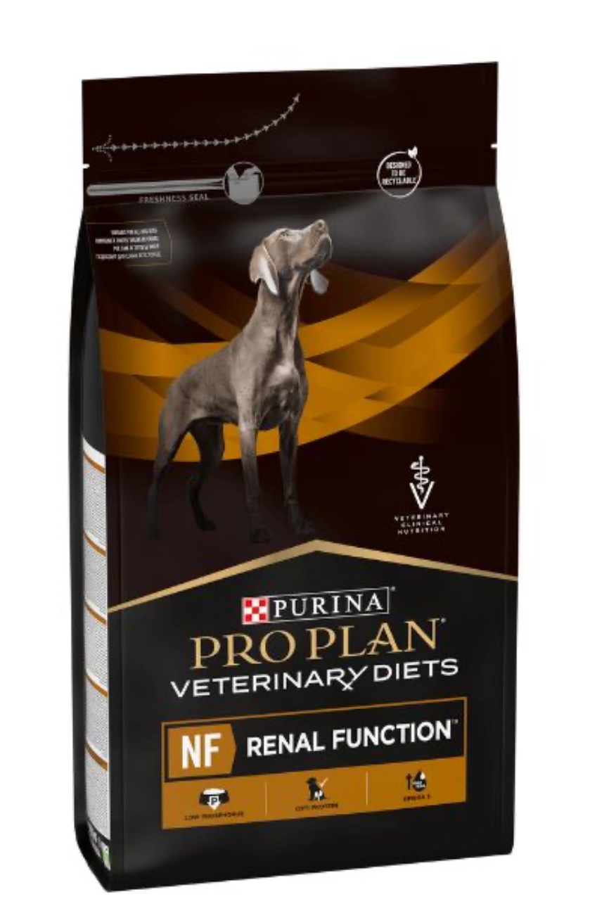 Purina pro plan veterinary diets renal function NF è un alimento dietetico completo per cani adulti per il supporto della funzione renale in caso di insufficienza renale cronica con ridotto tenore di fosforo e bassa concentrazione di proteine di elevata qualità. Crocchette light, ideali anche per la riduzione della formazione di calcoli di cistina e di calcoli di urati, con basso livello di proteine e proprietà alcalinizzanti dell’urina.