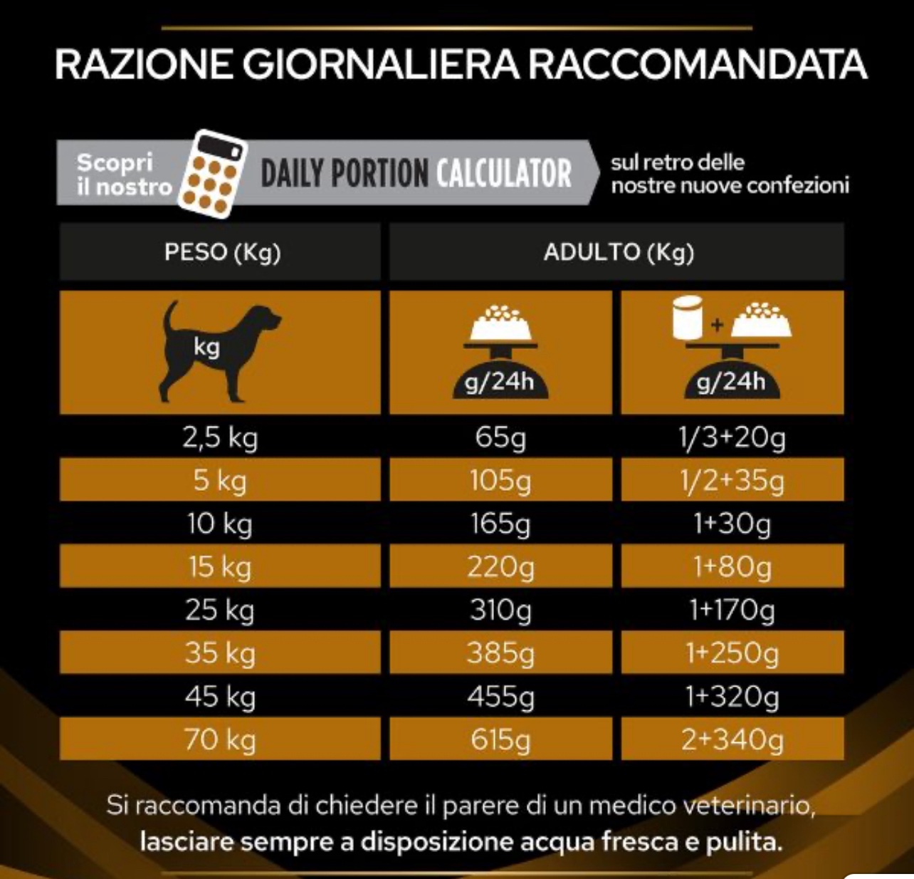 Per cani oltre i 70 kg di peso: per ogni 5kg di peso corporeo in più, somministrare ulteriori 30g di alimento secco. Il periodo d’uso raccomandato è inizialmente fino a 6 mesi per insufficienza renale cronica, fino a 6 mesi per la riduzione della formazione di calcoli a base di urati, ma per tutta la vita nei casi di disturbo irreversibile del metabolismo dell’acido urico e inizialmente fino ad 1 anno per la riduzione della formazione di calcoli a base di cistina. Si raccomanda di chiedere il parere di un veterinario prima dell’uso oppure prima di estendere il periodo di impiego. Si raccomanda acqua a volontà. Disponibile anche nel formato umido.