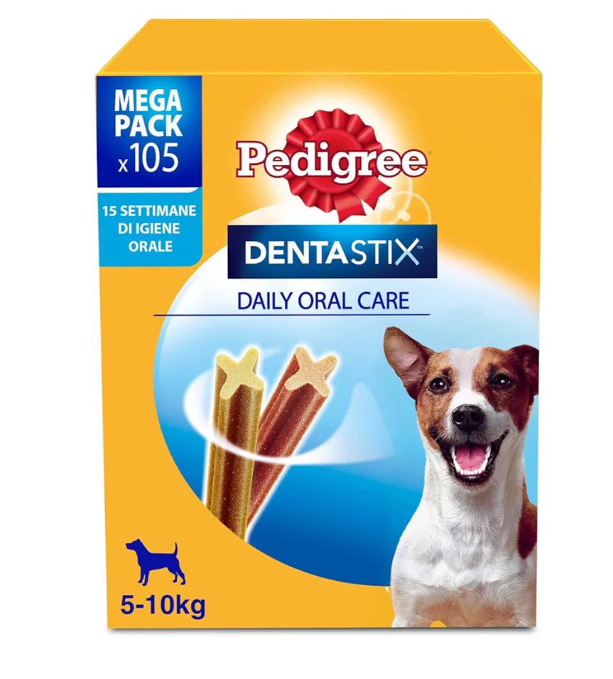 Pedigree Dentastix è lo snack per l’igiene orale del cane, che promuove la salute di denti e gengive. È scientificamente comprovato che Pedigree Dentastix riduce la formazione del tartaro fino all’80%, ciò grazie all’azione sinergica della sua composizione speciale e dei principi attivi ad azione pulente. I bastoncini Pedigree Dentastix sono interamente digeribili e non lasciano resti.