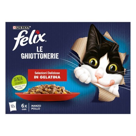 Multipack al gusto manzo e pollo. Felix Le Ghiottonerie è una gamma di ricette irresistibili, dall’aspetto, dal profumo e dal gusto così deliziosi, che ti sembrerà di averle cucinate con le tue mani! Ogni ricetta, preparata con ingredienti di qualità, ha teneri bocconcini in gelatina per offrire al tuo gatto un pasto irresistibile che amerà!