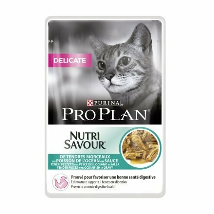 Purina® PRO PLAN® DELICATE: Supporta il benessere digestivo e aiuta a ridurre le reazioni della pelle connesse alla sensibilità alimentare. È altamente digeribile grazie agli ingredienti di alta qualità. Disponibile in salsa con Pesce dell’Oceano e in salsa con Tacchino.