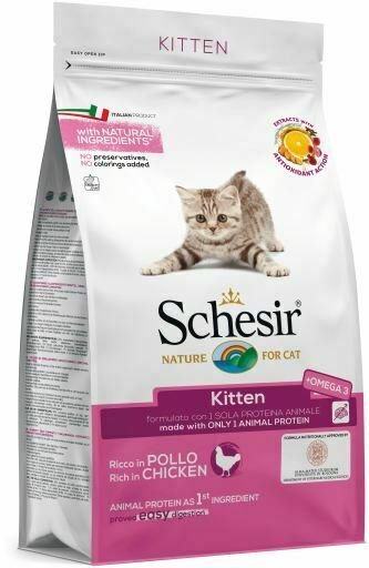 Schesi Dry è la linea di alimenti secchi di altissima qualità formulati con un’unica fonte proteica animale. Altamente digeribile e ricco di principi nutritivi essenziali per la salute, il benessere e lo sviluppo armonioso del gatto, Schesir Dry aiuta a mantenere il pelo lucido, la vista brillante e i denti sani e puliti grazie alla presenza di aloe vera e aminoacidi essenziali. L’utilizzo di numerose erbe officinali e di ingredienti biologicamente appropriati (senza soia, mais,nè OGM), contribuisce al benessere generale, allo sviluppo e al mantenimento dei muscoli e del sistema scheletrico, e aiuta a mantenere l’apparato urinario in buona efficienza.