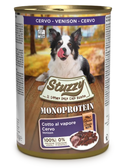 Saporitissimo cervo, in un alimento monoproteico completo. Prova subito Stuzzy Monoprotein Cervo per il tuo cane: digeribile e gustoso, grazie alla cottura al vapore, saprà conquistarlo sin dal primo boccone.