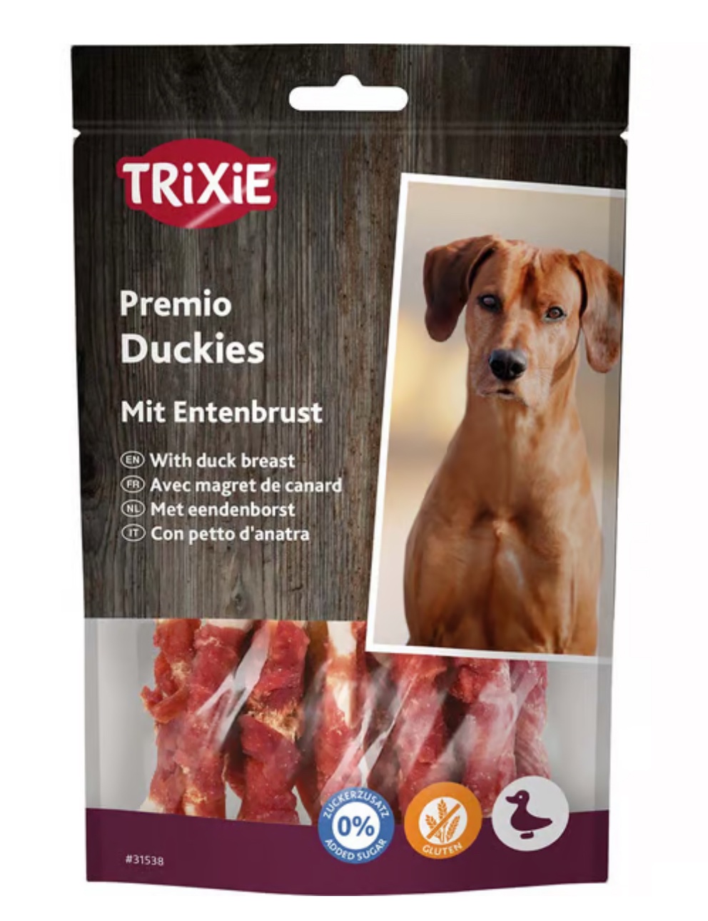 Lo snack Trixie Premio Duckies è confezionato in pratiche buste richiudibili salvafreschezza.