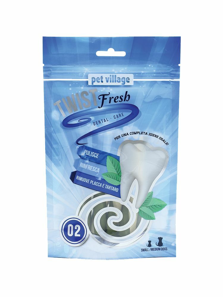 La particolare forma degli snack Dental Twist, abbinata alla prolungata azione meccanica della masticazione, contribuisce ad una corretta pulizia e a mantenere sano l’apparato dentale del tuo cane. Gli snack dentali TWIST Fresh aiutano a prevenire placca e tartaro e a mantenere i denti del tuo cane sempre sani e puliti. L’utilizzo quotidiano di TWIST Fresh assicura una corretta igiene orale, offrendo una piacevole azione rinfrescante e una masticazione gradevole e giocosa. La particolare forma degli snack TWIST Fresh, abbinata alla prolungata azione meccanica della masticazione, contribuisce ad una corretta pulizia e a mantenere sano l’apparato dentale.